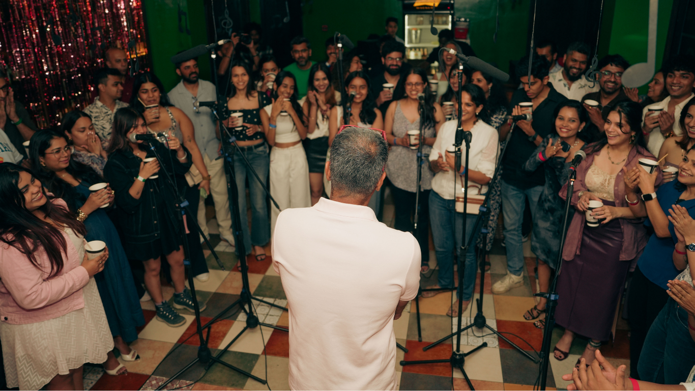 Not karaoke. We teach simple lines, sing in rounds, and record one joyful take.